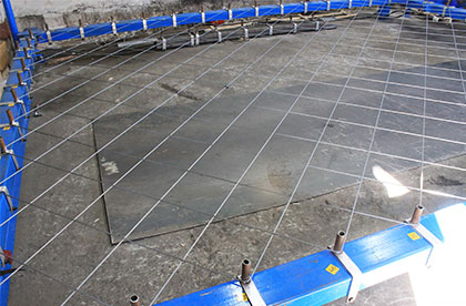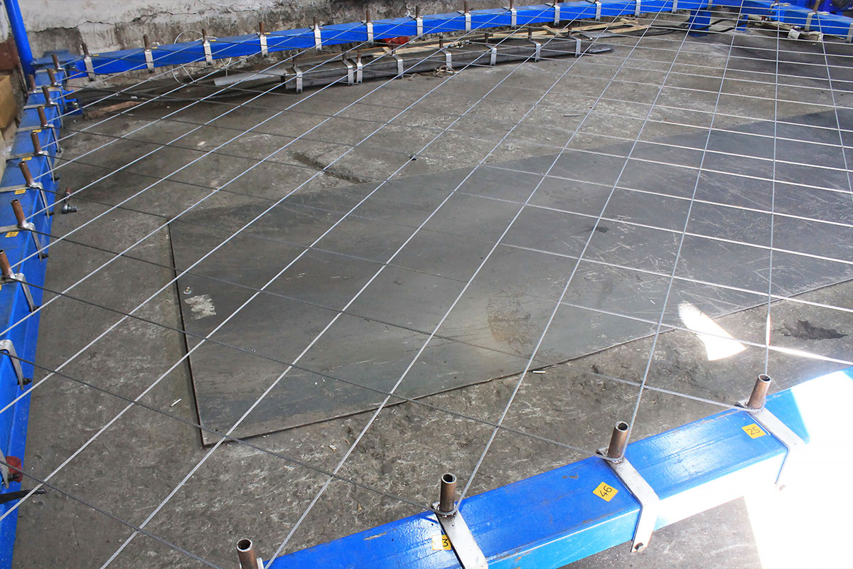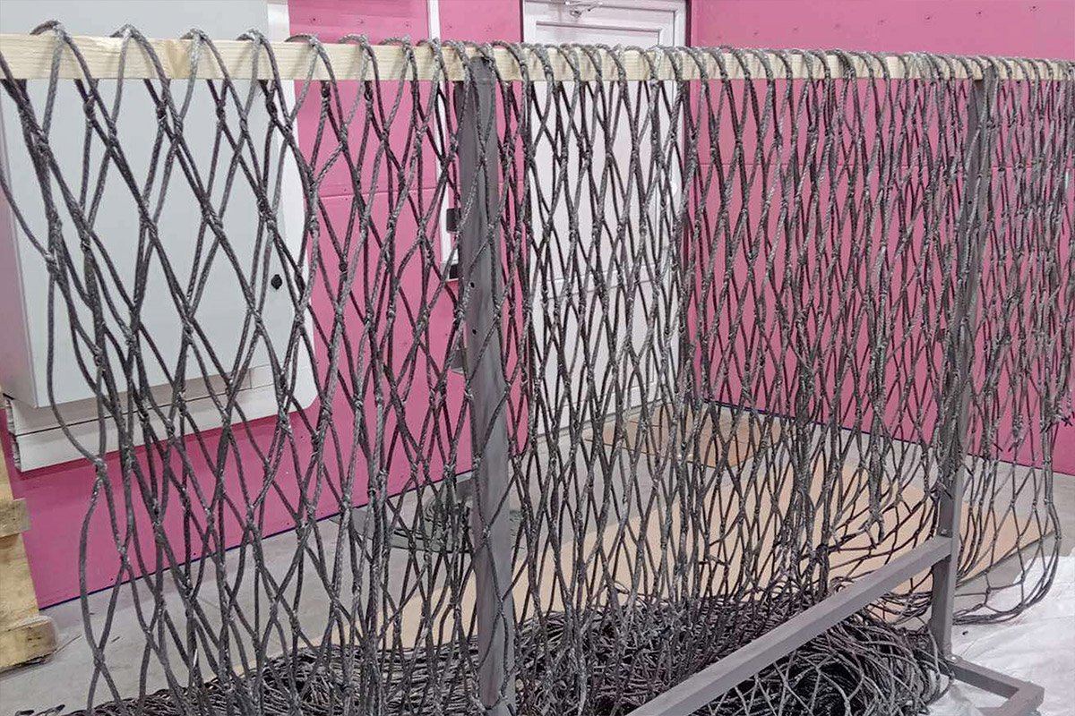 Виготовлення канатних сіток відбувається на стаціонарному стапельному обладнанні. Максимальний встановлений розмір стапеля 5000 мм з довшої сторони. Пропоновані розміри карт 5000х4000 та 5000х3200 наближені до технологічного максимуму та є універсальними. Такі полотна мають невелику вагу, легко згортаються в рулон, зручні в транспортуванні та перенесенні.